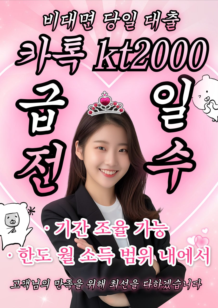 | 제목 | 카톡 kt2000 개인돈 급전 일수 월변 급여일 맞춤 상환 가능, 최대 한달까지 기간 조율 | ||||