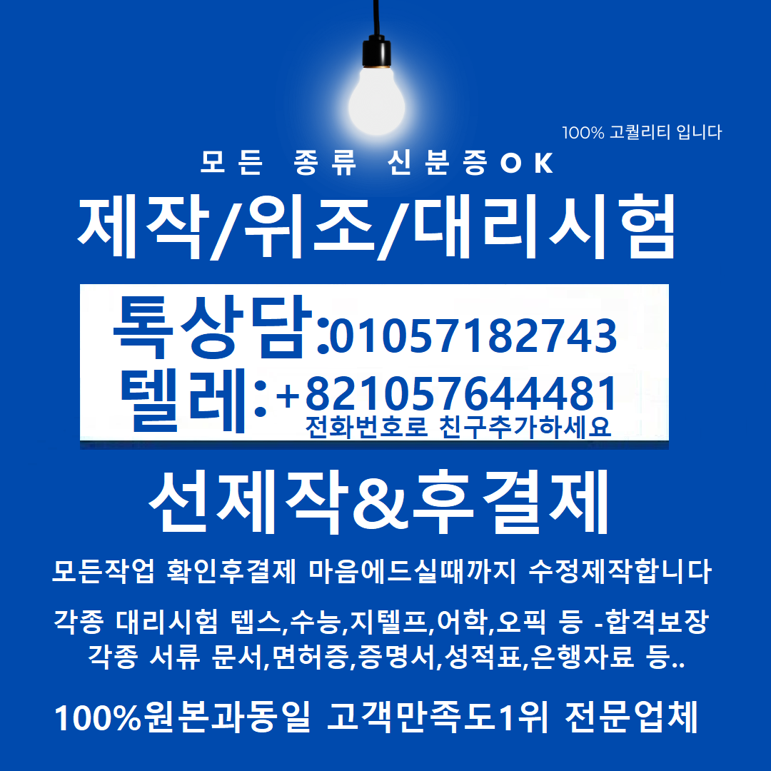 ▣ 고객님께 철통 보안과 안전한 시스템으로 완벽한 증명서를 제공해 드립니다. ▣마음에드실때까지 수정제작합니다→→→ 태어나면서부터 인생을 마감하는날까지 필요한 각종 서류 증명서 ▣오래된경력과기술보유전문.....확실한곳을만나서 안전한 업체와 제대로 상담하시고 결정하십시요. 『민증위조 『토익위조 『여권위조『통장위조 『졸업장위조 『졸업증명서위조 『합격증위조 『성적표위조 『학생증위조 『신분증위조『JPT위조 『JLPT위조 『OPIC위조 『TEPS위조 『IELTS위조 G-TELP위조 『토익성적표위조 『토플성적표위조 『수능성적표위조 『오픽성적표위조 『텝스성적표위조 『시험성적표위조 『휴학증명서위조 『주민등록등초본위조 『아이엘츠위조 『HSK위조 『텝스위조 『오픽위조 『지텔프위조 『toeic위조 『toefl위조 『합격증명서위조 『주민등록증위조 『운전면허증위조 『여권위조 『여권제작 『통장위조 『통장제작 『학위증위조 『자격증위조 『진단서위조 『병원진단서위조 『보험위조 『보험금청구 『사실확인서위조 『경력증명서위조 『인감증명서위조 『상해진단서위조 『자동차등록증위조 『대출위조 『사업자등록증위조 『실시간위조 『의사면허위조 『직인위조 『위임장위조 『각종대리시험 텝스대리시험 수능대리시험 토익대리시험 토플대리시험 어학대리시험 등등... |